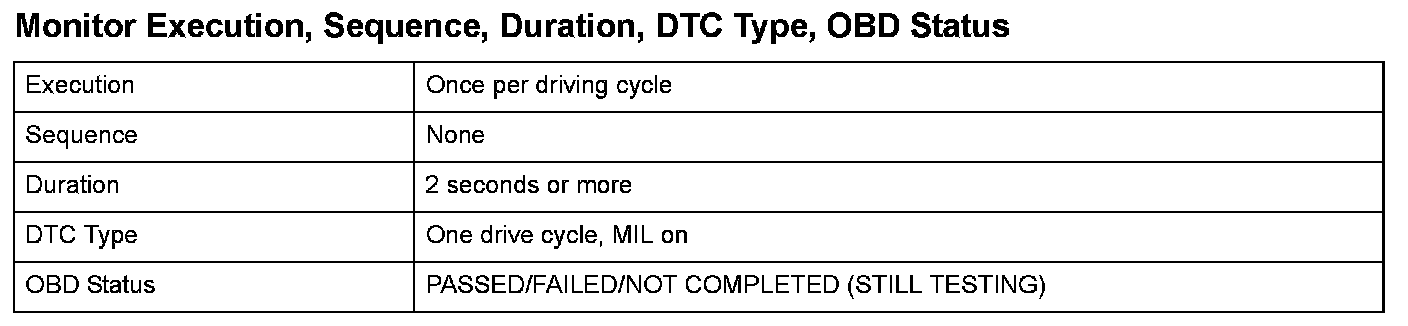 Monitor Execution, Sequence, Duration, DTC Type, OBD Status