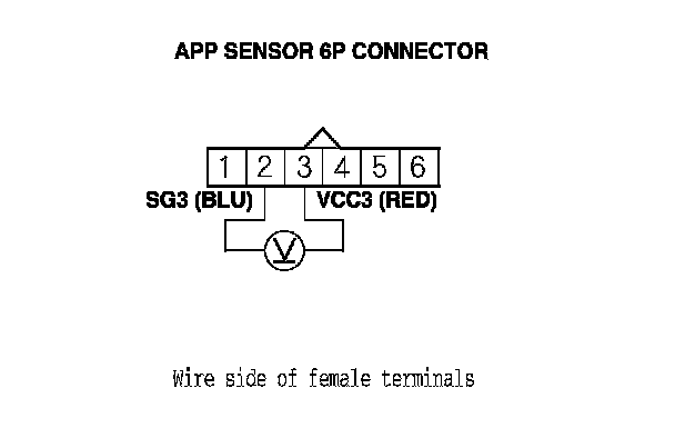 6. Measure the voltage between APP sensor 6P connector terminals No. 2 and No. 3.