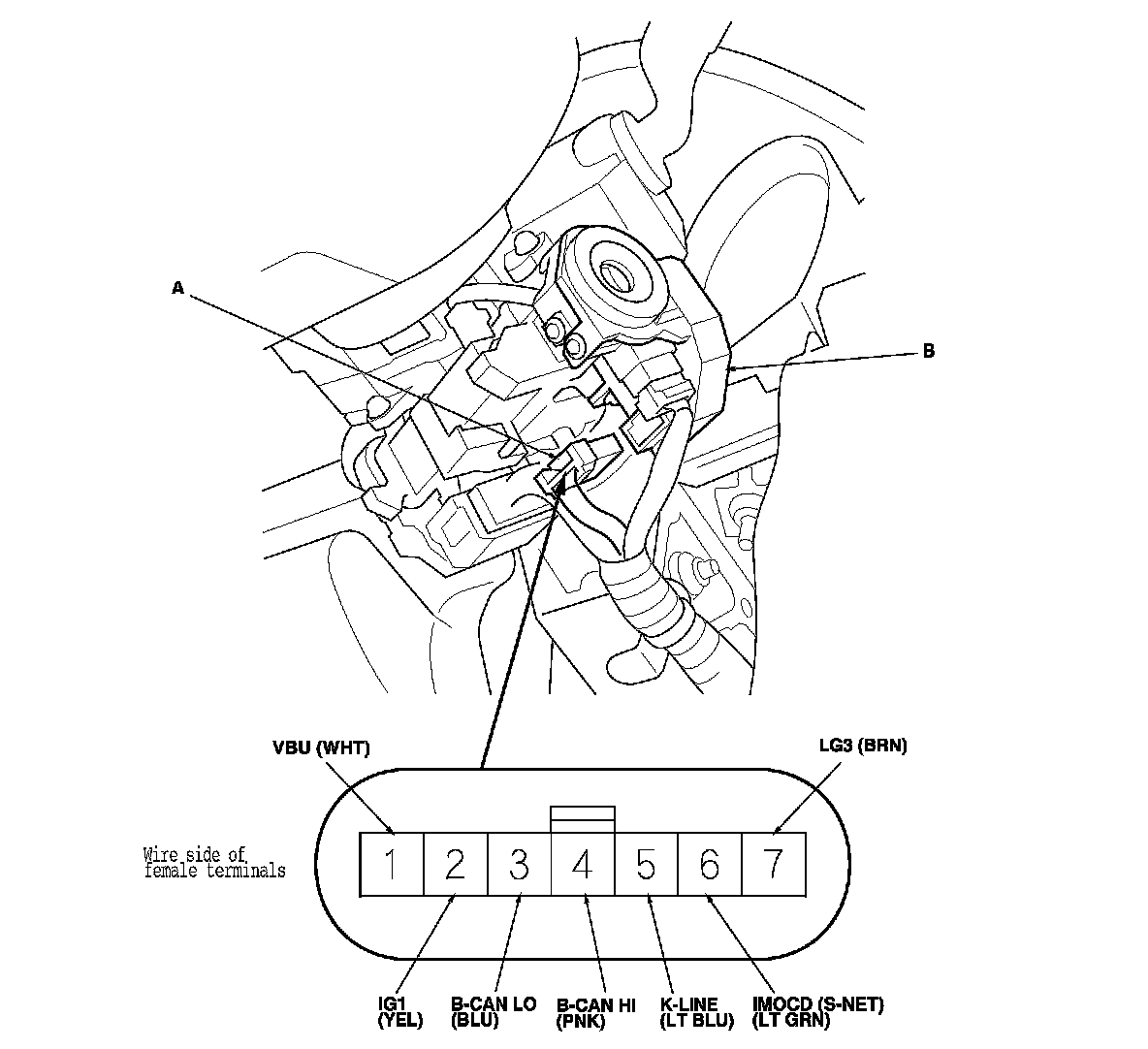 2. Disconnect the 7P connector (A) from the immobilizer-keyless control unit (B).
