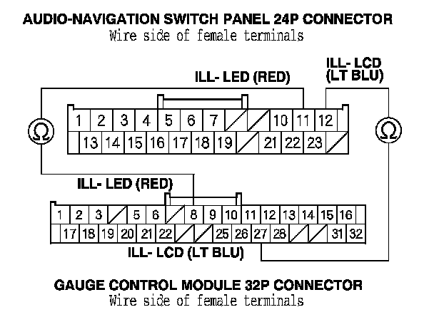 7. Check for continuity between audio-navigation switch panel 24P connector terminals No. 11 and No. 12 and gauge control module 32P connector terminal No. 8 and No. 27.