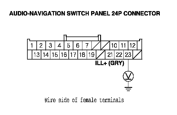 9. With the headlight switch still on, measure the voltage between audio-navigation switch panel 24P connector terminal No. 23 and body ground.
