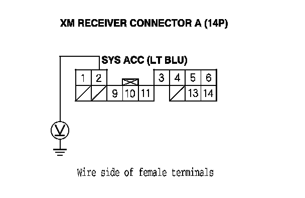 9. Measure the voltage between XM receiver connector A (14P) terminal No. 1 and body ground.