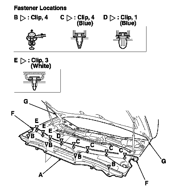 -3 Release the hood hinge covers (F) from both hood hinges (G).
