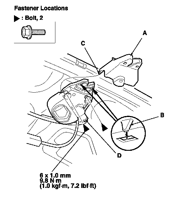 3. Disconnect the trunk lid latch connector (D), and remove the bolts, then remove the trunk lid latch.