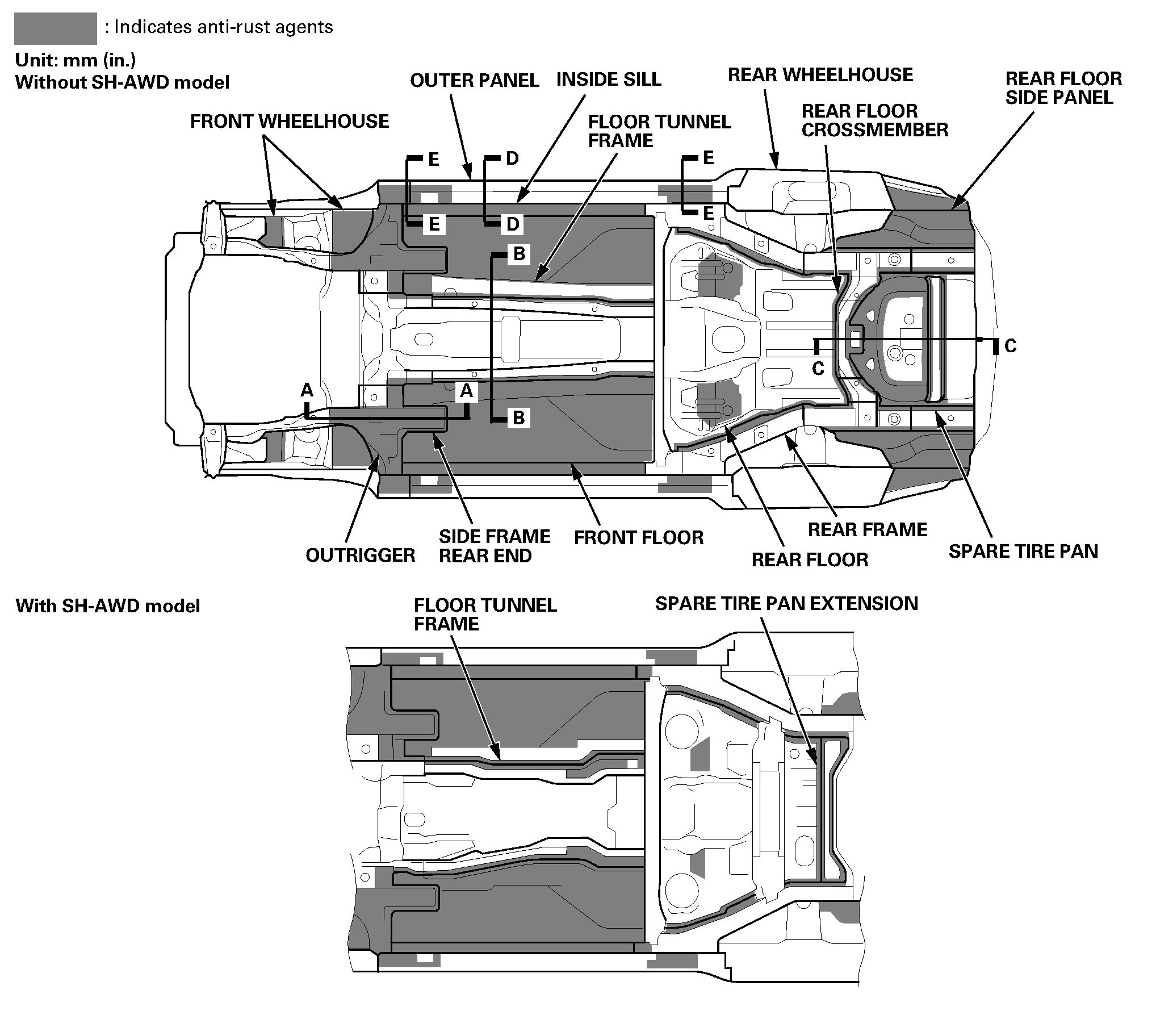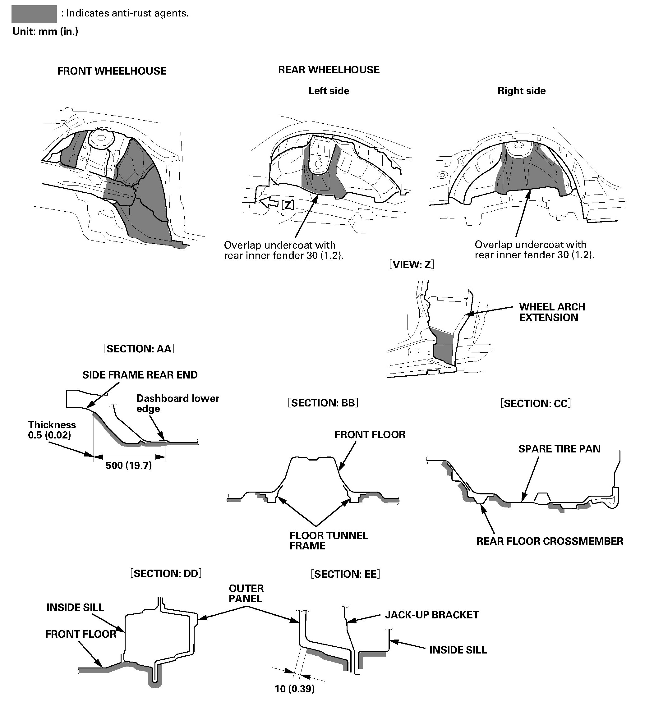 Front wheelhouse, rear wheelhouse, and dashboard lower coating thickness: 0.5 mm (0.02 in.).
