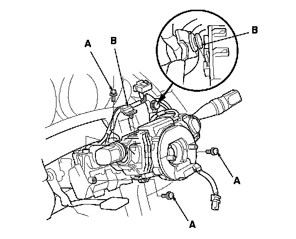 5. Remove the combination switch assembly/cable reel mounting screws (A).