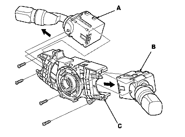 8. Remove the combination light switch (A) and the wiper/washer switch (B) from the combination switch body assembly (C).