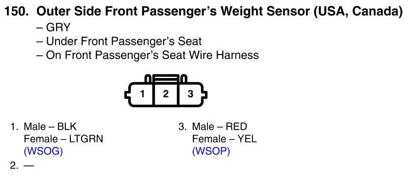 View 150 - Outer Side Front Passenger's Weight Sensor Connector View (USA, Canada)