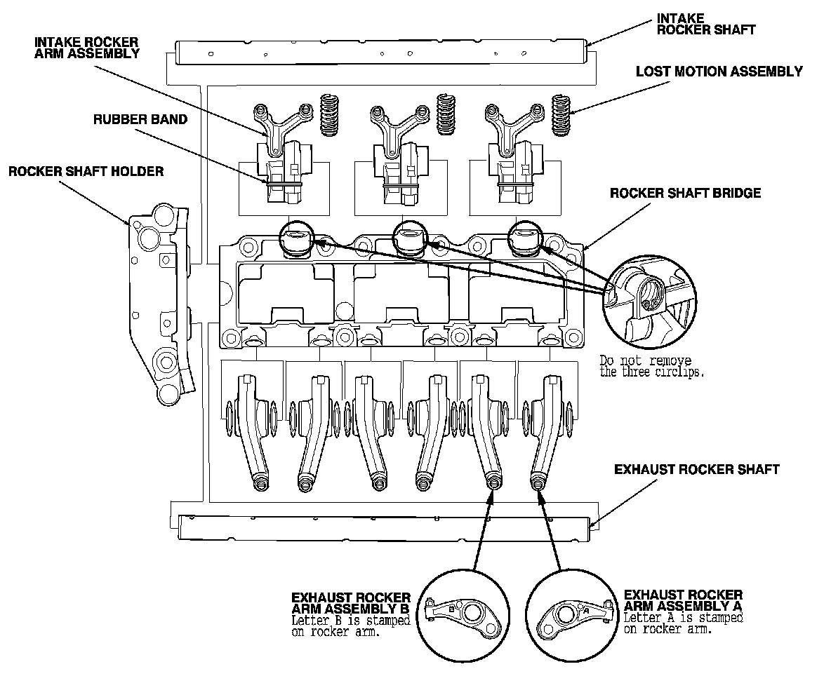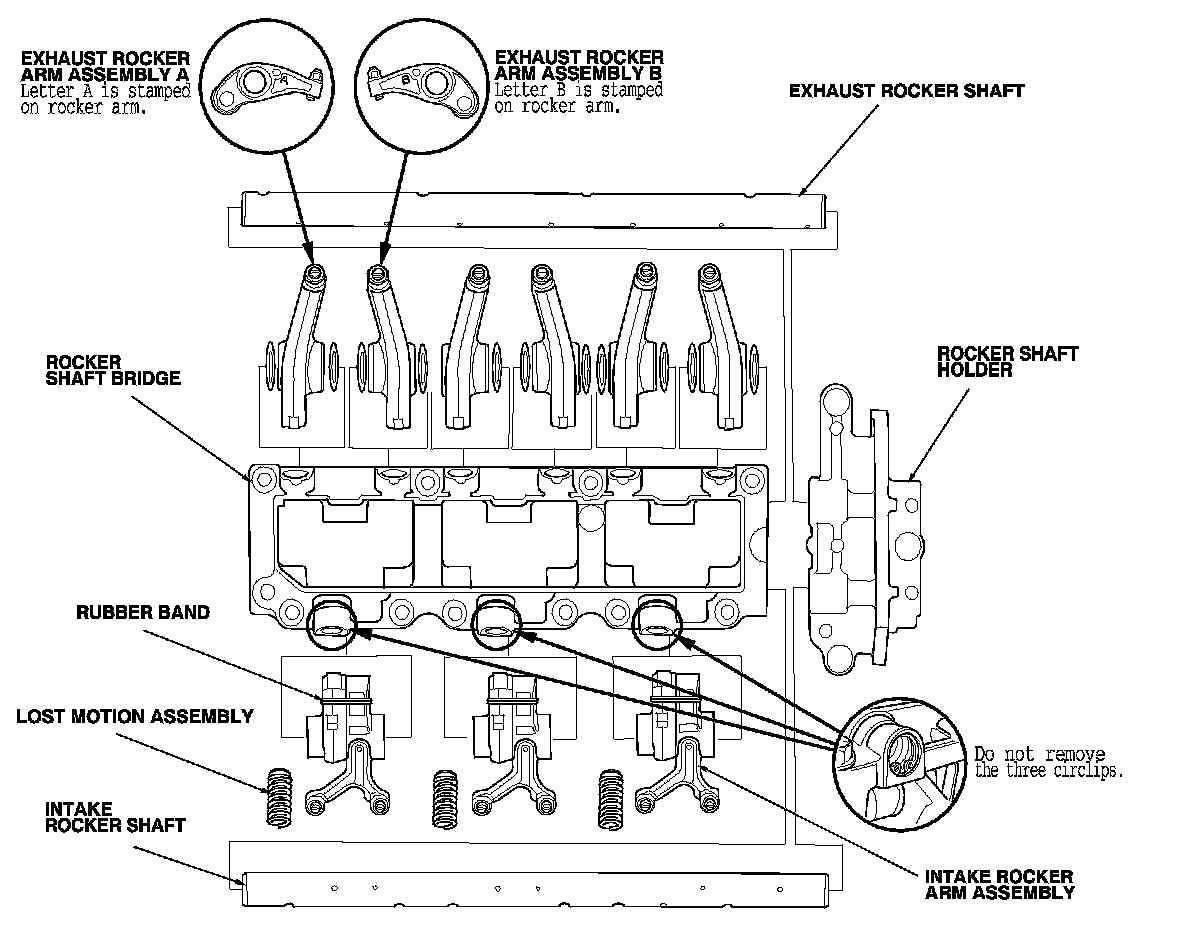 - Never remove any of the circlips that retain the lost motion assemblies in the rocker shaft bridge. The circlips are not available separately, and are factory installed in the rocker shaft bridge. To remove the lost motion assemblies, first remove the rocker shafts and the rocker arms.
