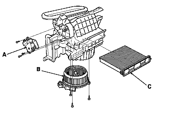 - The recirculation control motor (A), the blower motor (B), and the dust and pollen filter (C) can be replaced without removing the blower unit.