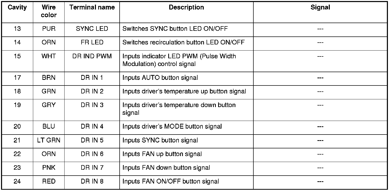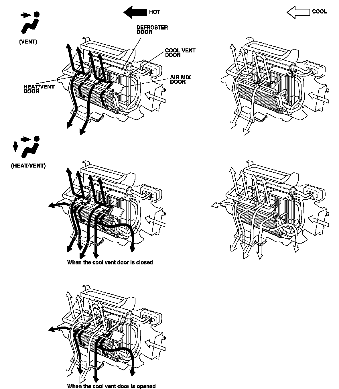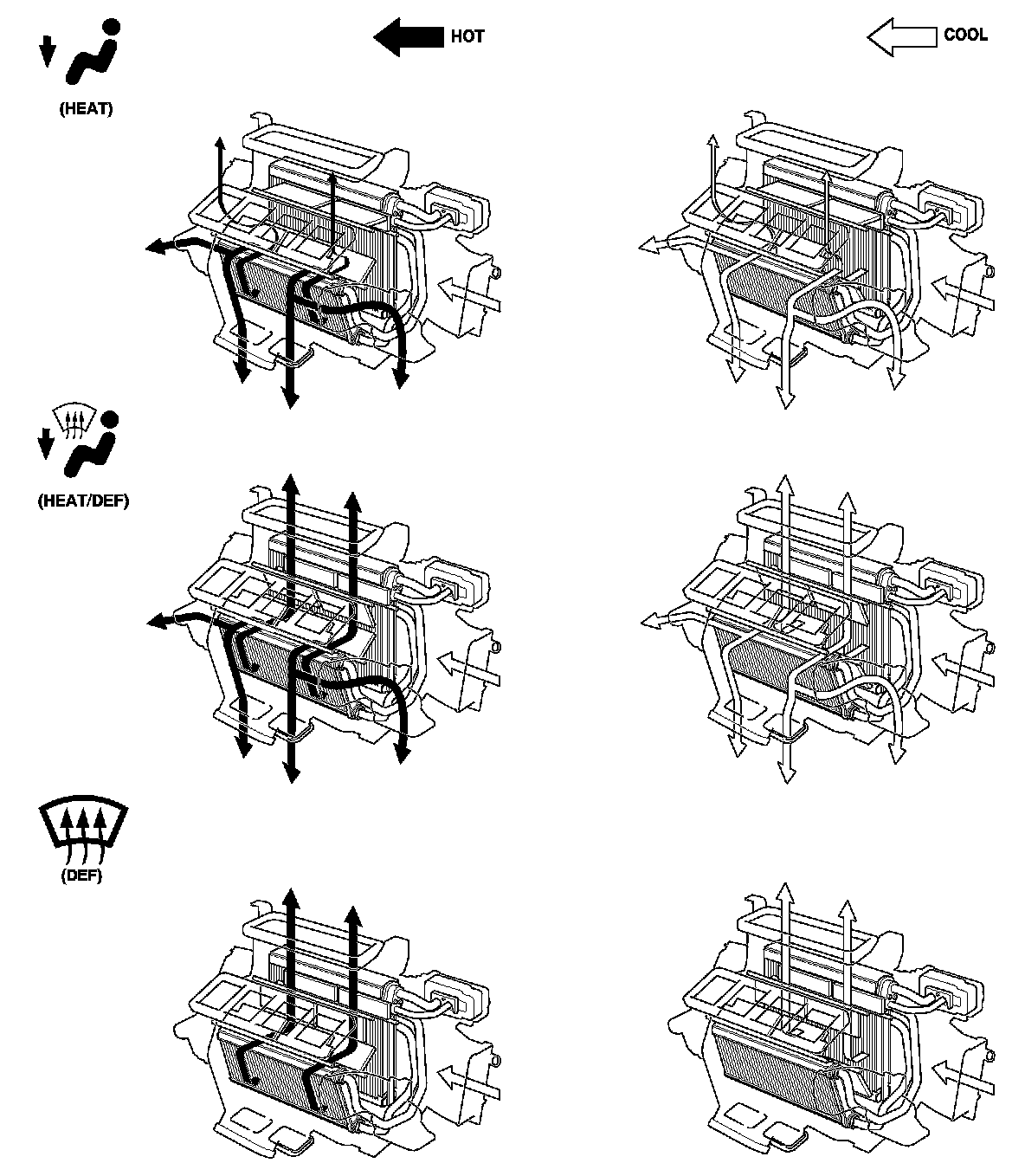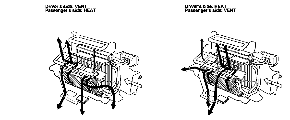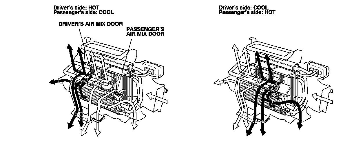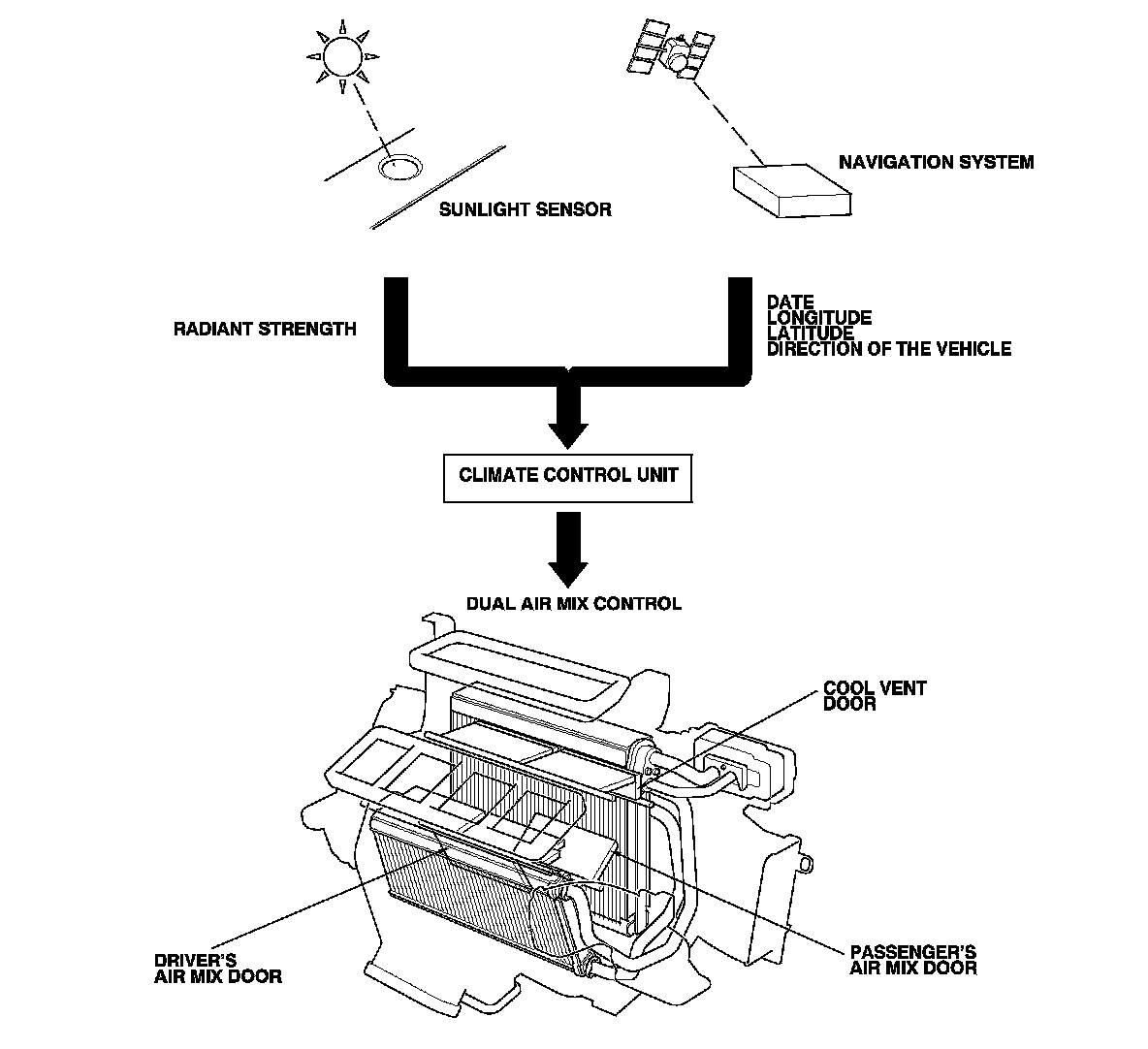 This system automatically controls the temperature and the air direction to the driver and passenger's side depending on the angle of the sun and the direction of the vehicle. It calculates information such as date, time, longitude, and latitude from the navigation system, as well as the radiant strength of the sun from the sunlight sensor, to determine the appropriate mode position and temperature to be directed to each side.