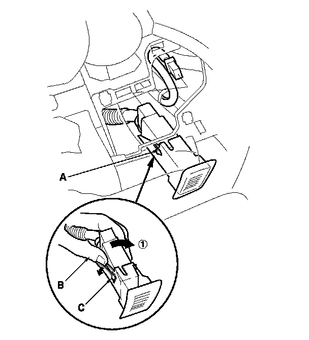 4. Unhook the left lock tab (A) of the humidity/in-car temperature sensor by pushing your thumb (B) between the sensor and tab (C).