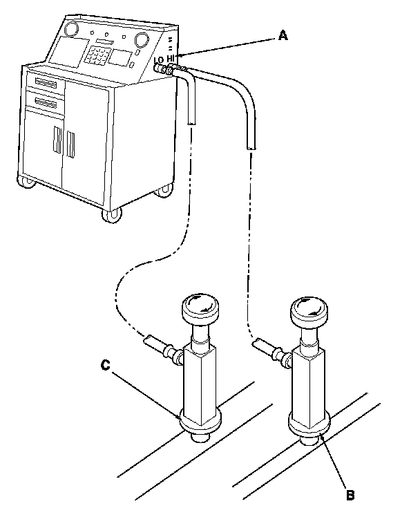 2. Connect an R-134a refrigerant recovery/recycling/charging station (A) to the high-pressure service port (B) and the low-pressure service port (C), as shown, following the equipment manufacturer's instructions. Recover the refrigerant, if any, from the A/C system. A/C Refrigerant Recovery