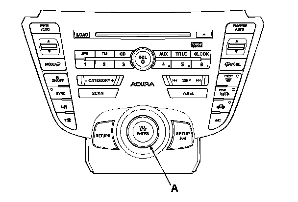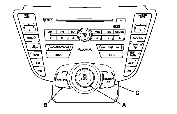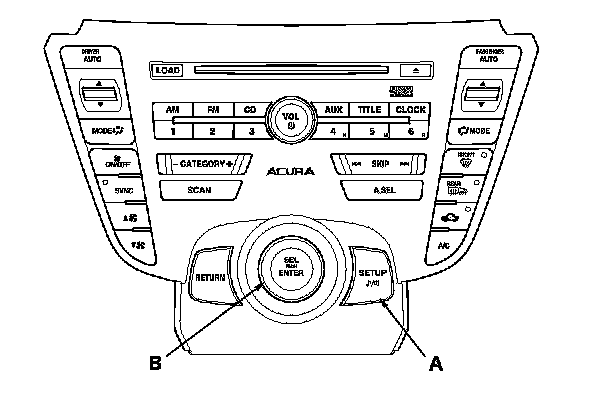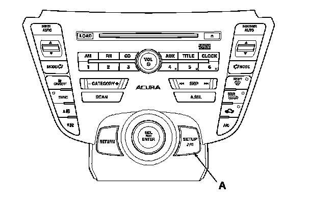 2. Turn the ignition switch to ON (II), then press and hold the SET UP button (A) on the audio panel for about 5 seconds until you hear a beep. The display shows the compass setting menu items.
