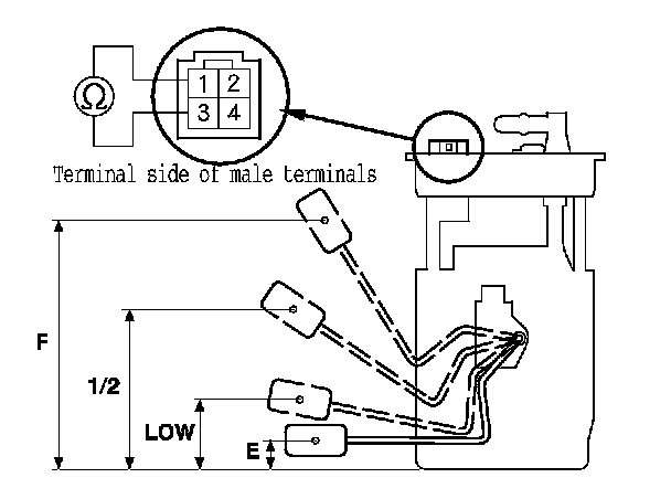 10. Measure the resistance between fuel tank unit 4P connector terminals No. 1 and No. 3 with the float at E (EMPTY), LOW (LOW FUEL INDICATOR), 1/2 (HALF FULL), and F (FULL) positions.
