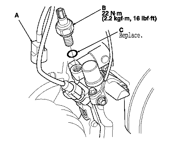 3. Apply a very small amount of liquid gasket to the oil pressure switch threads, then install the oil pressure switch with a new O-ring (C).