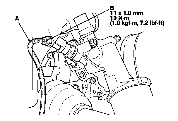 5. Install a rubber hose (A) on the drain bolt (B) located at the rear of the engine block, then loosen the drain bolt.
