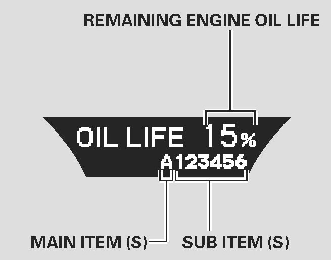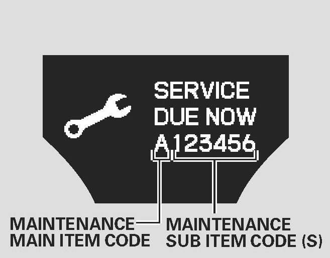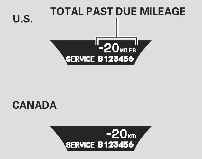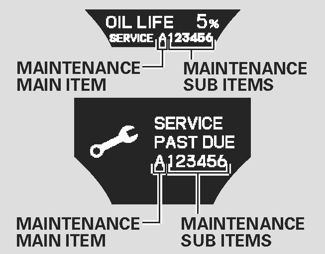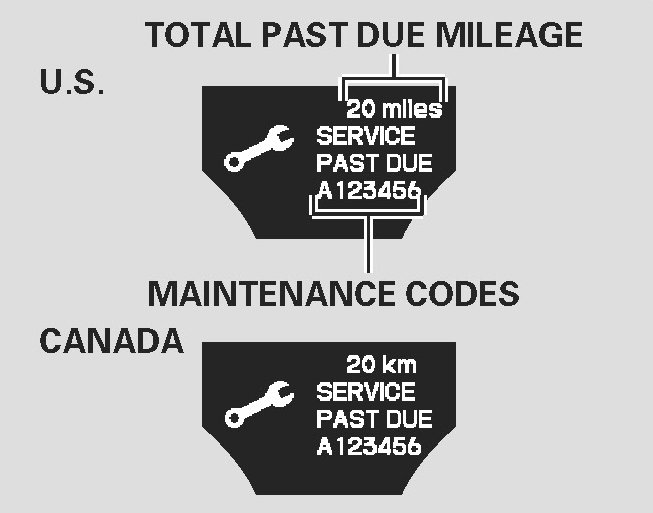 If the indicated required service is not done and the remaining engine oil life becomes 0% the multi-information display will show a "SERVICE PAST DUE" message the total mileage after the remaining oil life became "0%" and the maintenance item code(s).
