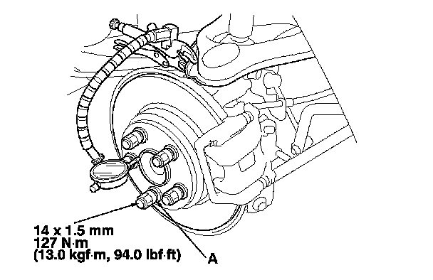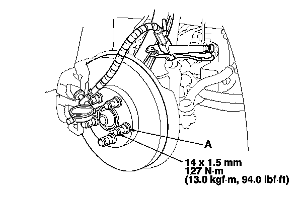 3. Install suitable flat washers (A) and the wheel nuts. Tighten the nuts to the specified torque value to hold the brake disc or the brake disc/drum securely against the hub.