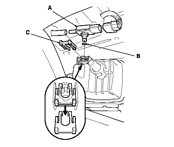4. Install the parts in the reverse order of removal with a new O-ring (B) and a new retainer (C).