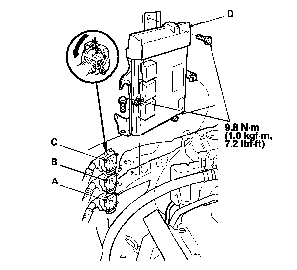 12. Disconnect PCM connectors A, B, and C, then remove the PCM assembly (D).