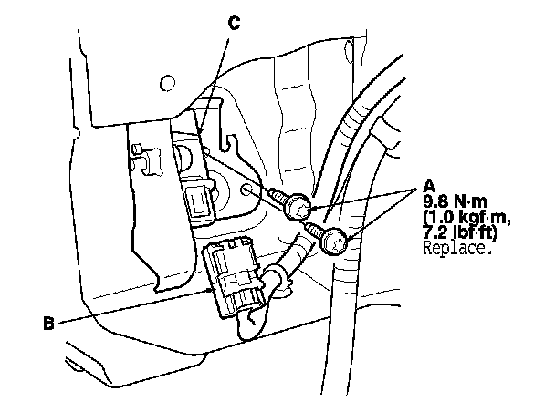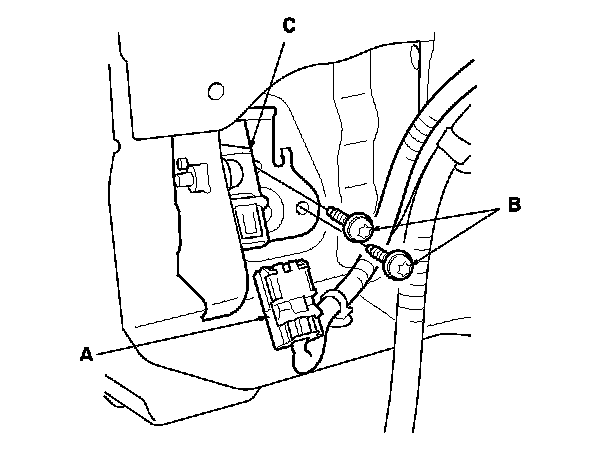 1. Install the front impact sensor with new TORX bolts (A), then connect the left or right engine compartment wire harness 2P connector (B) to the front impact sensor (C).