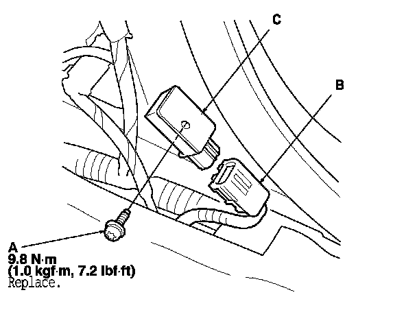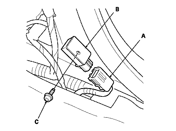 1. Install the side impact sensor (first) with a new TORX bolt (A), then connect the SRS floor wire harness 2P connector (B) to the side impact sensor (first) (C).