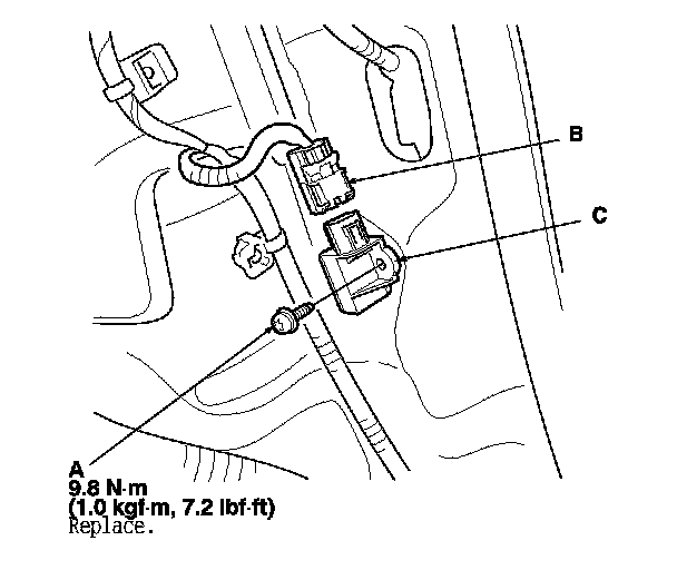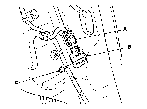 1. Install the side impact sensor (second) with a new TORX bolt (A) then connect the SRS floor wire harness 2P connector (B) to the side impact sensor (second) (C).