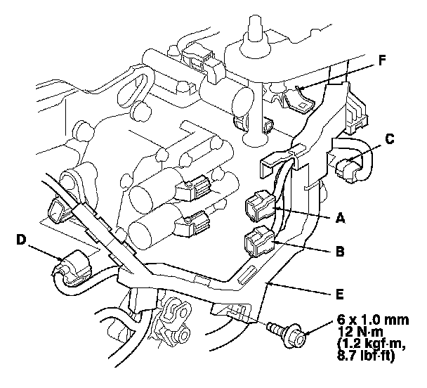 13. Remove A/T clutch pressure control solenoid valves A and B, the ATF pipes (C), and the gasket (D).