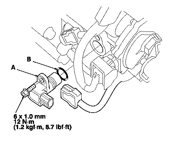 3. Install a new O-ring (B) on a new output shaft (countershaft) speed sensor, then install the output shaft (countershaft) speed sensor and the sensor washer.