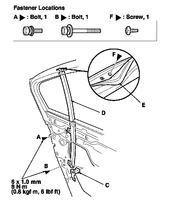 9. Remove the bolts (A, B) and the collar (C) from the rear lower channel (D). Pull the door weatherstrip (E) away as needed, and remove the screw (F).