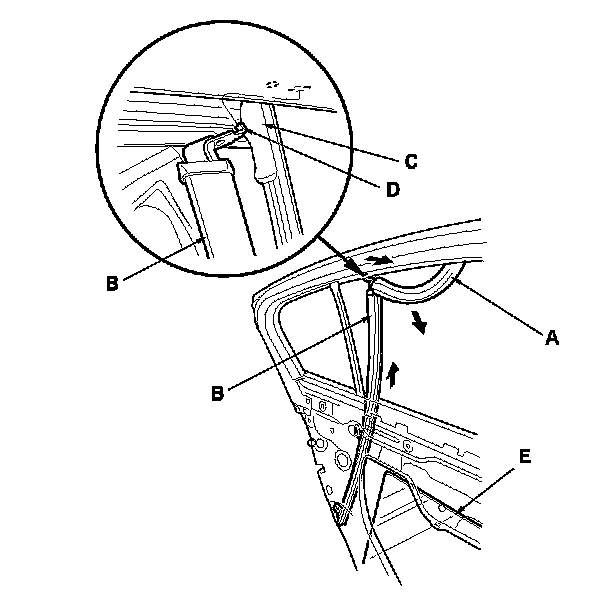 10. Pull the glass run channel (A) away as needed. Pull the rear lower channel (B) forward from the quarter glass seal (C), then release the upper hook (D) from the door. Remove the rear lower channel from the rear door glass (E), then pull the channel up to remove it.