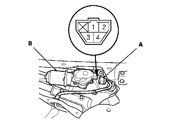 3. Disconnect the 4P connector (A) from the windshield wiper motor (B).