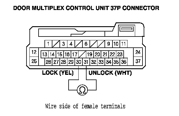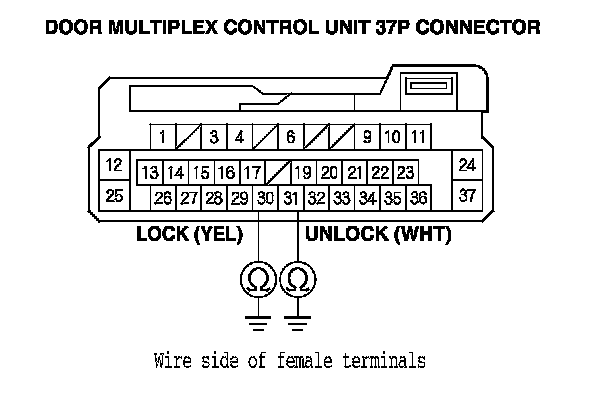 11. Check for continuity between body ground and door multiplex control unit 37P connector terminals No. 30 and No. 31 individually.