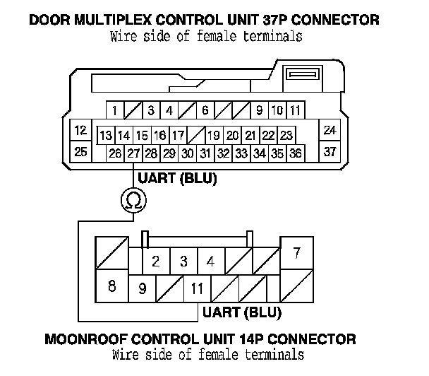 8. Check for continuity between power window master switch 37P connector terminal No. 27 and moonroof control unit 14P connector terminal No. 11.