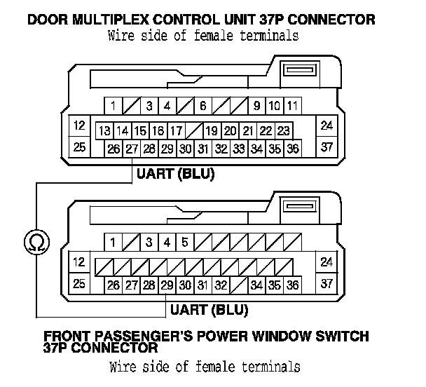 10. Check for continuity between door multiplex control unit 37P connector terminal No. 27 and front passenger's power window switch 37P connector terminal No. 29.