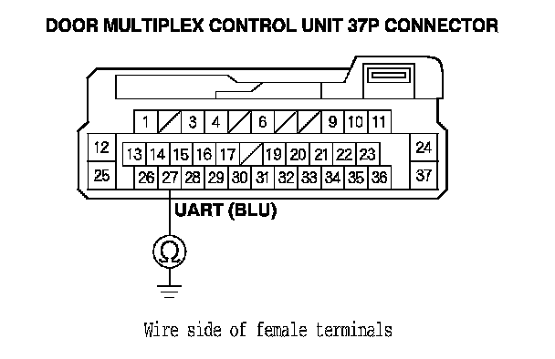 11. Check for continuity between door multiplex control unit 37P connector terminal No. 27 and body ground.