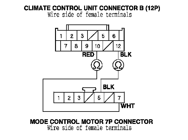 9. Check for continuity between the following terminals of climate control unit connectors A (28P), B (12P), and the mode control motor 7P connector.