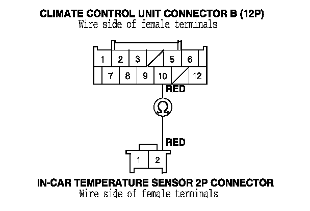 9. Check for continuity between climate control unit connector B (12P) terminal No. 10 and the in-car temperature sensor 2P connector terminal No. 2.