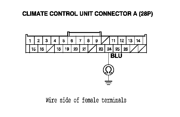 8. Check for continuity between climate control unit connector A (28P) terminal No. 24 and body ground.