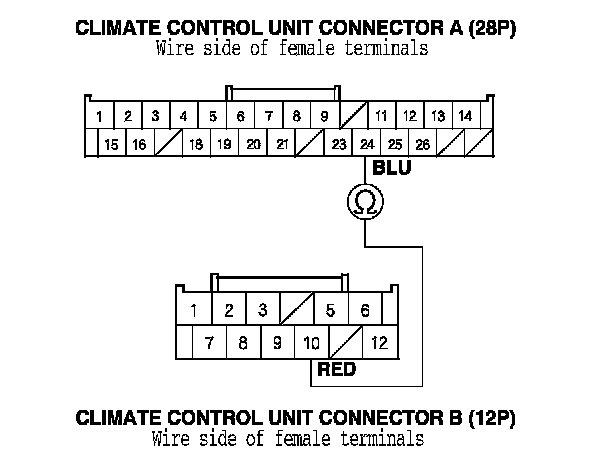 9. Check for continuity between climate control unit connector A (28P) terminal No. 24 and climate control unit connector B (12P) terminal No. 10.