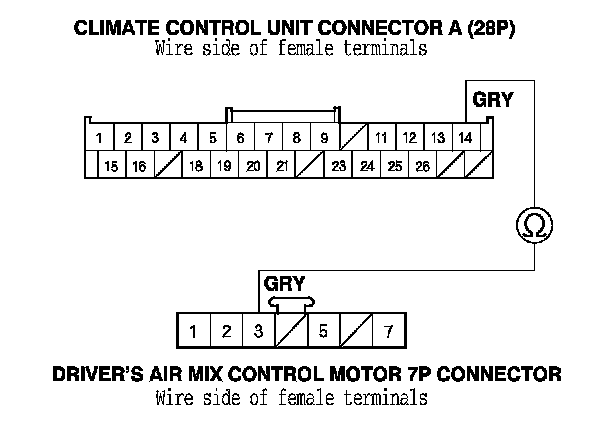 9. Check for continuity between the following terminals of climate control unit connectors A (28P), B (12P), and the driver's air mix control motor 7P connector.