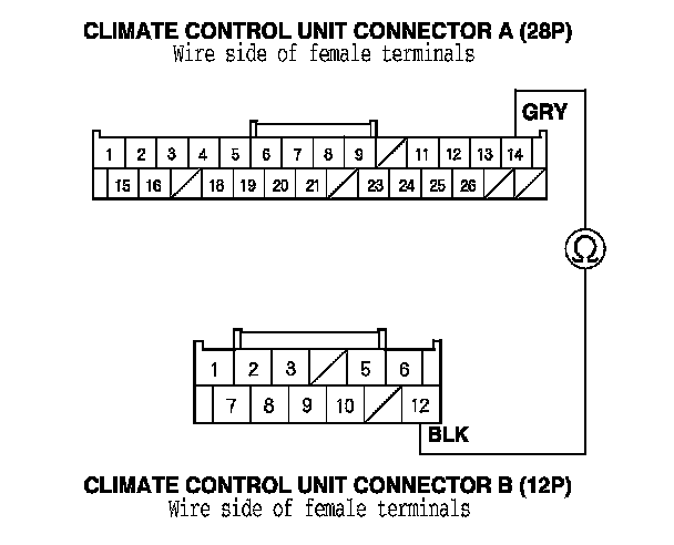 11. Check for continuity between climate control unit connector A (28P) terminal No. 14 and climate control unit connector B (12P) terminal No. 12.