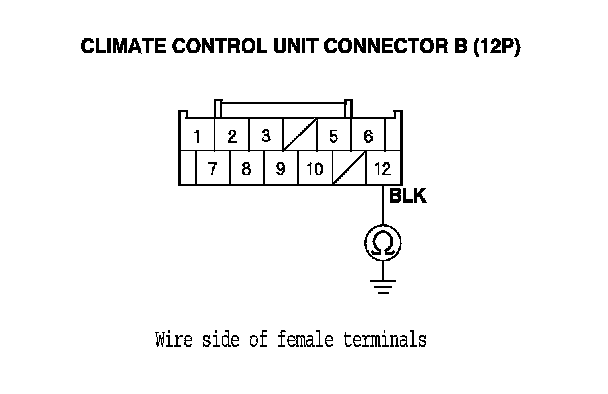 15. Check for continuity between climate control unit connector B (12P) terminal No. 12 and body ground.