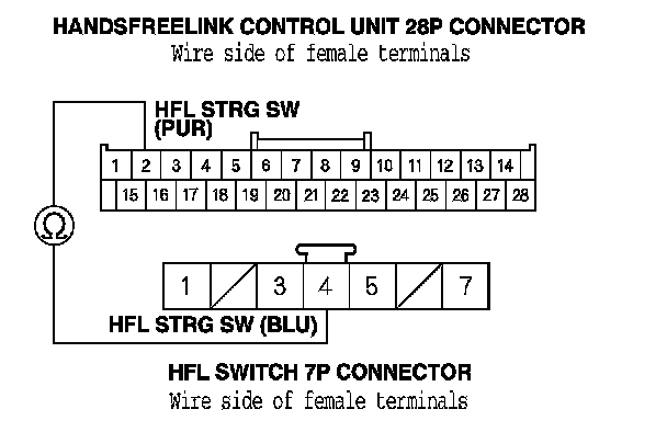 12. Check for continuity between HandsFreeLink control unit 28P connector terminal No. 2 and HFL switch 7P connector terminal No. 4.