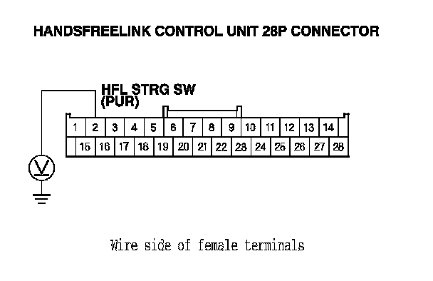 14. Measure the voltage between HandsFreeLink control unit 28P connector terminal No. 2 and body ground.