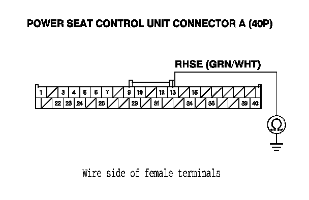 13. Check for continuity between body ground and power seat control unit connector A (40P) terminal No. 13.