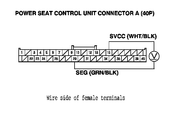 25. Measure the voltage between power seat control unit connector A (40P) terminals No. 15 and No. 29.
