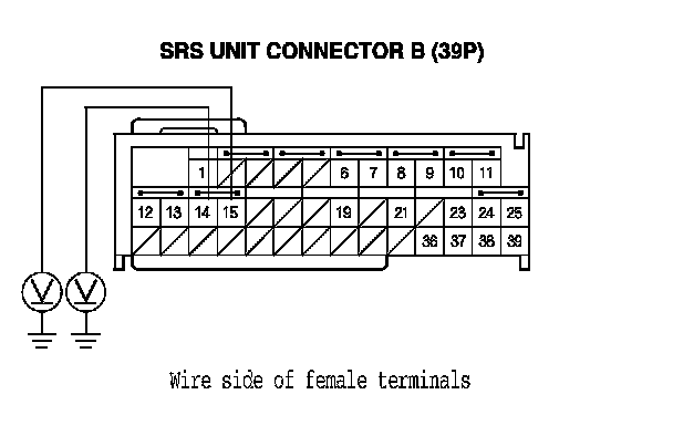17. Measure the voltage between body ground and SRS unit connector B (39P) terminals No. 14 and No. 15 individually. There should be less than 0.2 V.