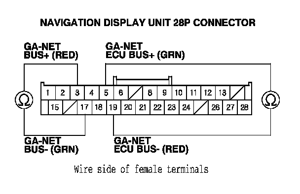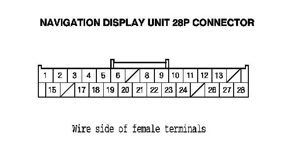 12. Check for continuity between navigation display unit 28P connector terminals No. 5 and No. 19, and terminals No. 3 and No. 17.